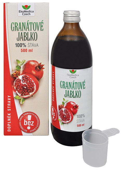 EkoMedica Granátové jablko 100 % šťáva je získávána z plodů granátového jablka, nazývaného také elixír mládí, nejmodernějším způsobem výroby. Šťáva je doplněna extraktem z nutričně vysoce hodnotných plodů camu-camu. Produkt je stabilizován pouze šetrnou pasterizací, neobsahuje chemické konzervanty. Šťáva je proto určena co nejširšímu spektru konzumentů.