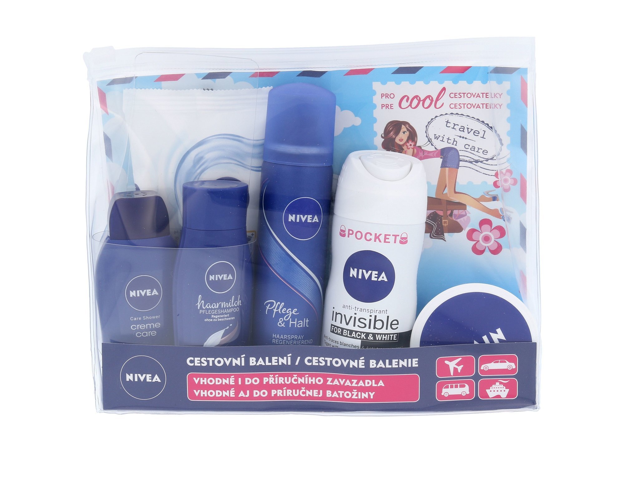 Nivea Care pečující krém 50 ml + sprchový gel 50 ml + šampon 50ml + lak na vlasy 75ml + antiperspirant 100ml + pleťové ubrousky 3v1 7ks + cestovní taštička