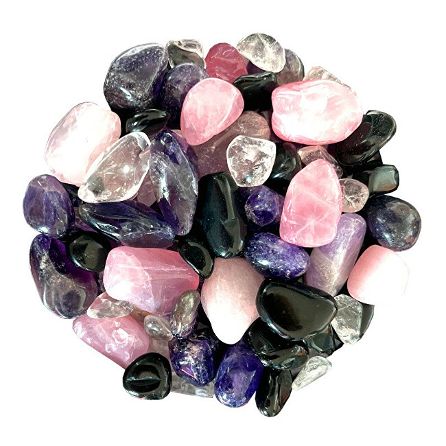 Prémiový mix tromlovaných polodrahokamů, křišťál, ametyst, růženín a onyx, značky Jungle Way, jež lze využít jako dekoraci, k osobním rituálům, do džbánu s vodou či jako náhradní náplň do skleněných láhví.
