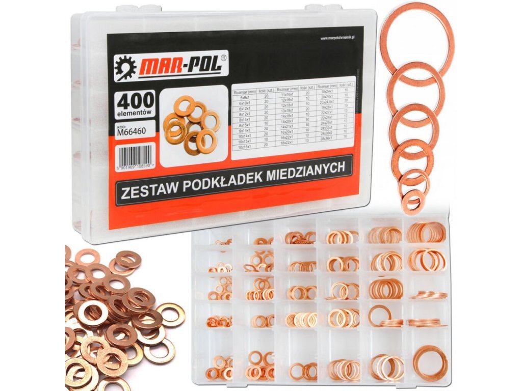 Sada měděných podložek 400ks MAR-POLSada 400ks měděných podložek umístěná v plastovém kufříku s přihrádkami.Obsah balení:5x9x1mm - 20ks, 6x10x1mm - 20ks, 6x12x1mm - 20ks, 8x12x1mm - 20ks, 8x15x1mm - 10ks, 9x14x1mm - 20ks, 10x14x1mm - 20ks, 10x15x1mm - 10ks, 10x16x1mm - 20ks, 11x16x1mm - 20ks,...