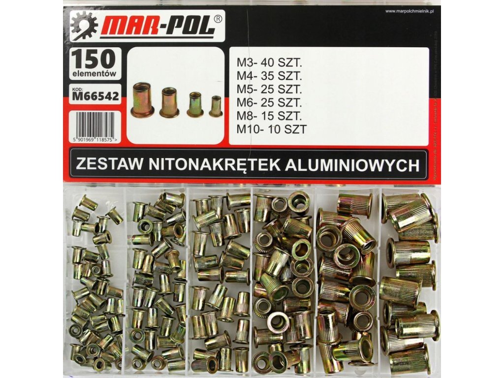 Nýtovací matice, sada 150ks, M3-M10, ocelové MAR-POLRozměry40 ks M3 x 9 mm35 ks M4 x 11 mm25 ks M5 x 13 mm25 ks M6 x 15 mm15 ks M8 x 18 mm10 ks M10 x 21 mm prečítať celé