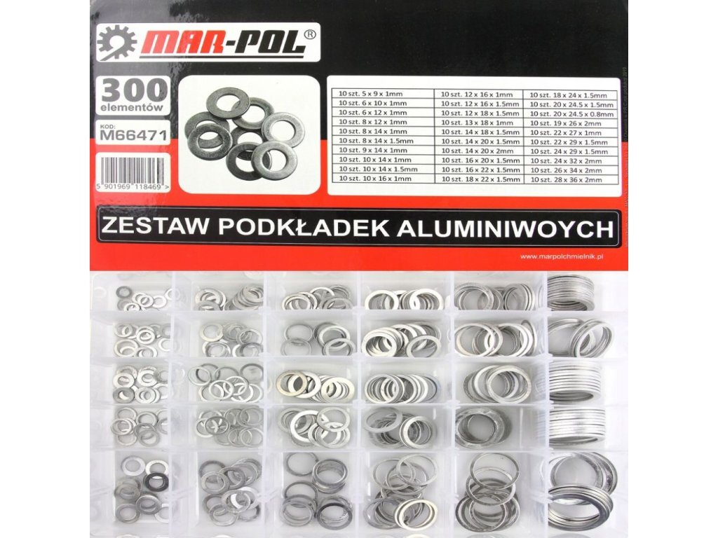 Hliníková podložka, sada 300ks MAR-POLSada 300ks hliníkových podložek umístěná v plastovém kufříku s přihrádkami.SADA OBSAHUJE:VNITŘNÍ PRŮMĚR (mm) - VNĚJŠÍ PRŮMĚR (mm) - TLOUŠŤKA (mm) - MNOŽSTVÍ KUSŮ5 mm x 9 mm x 1 mm - 10 kusů6 mm x 10 mm x 1 mm - 10 kusů6 mm x 12 mm x 1 mm - 10 kusů8 mm x 12 mm...
