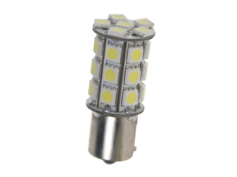 Náhradní LED žárovka s paticí BA 15s bílá, 27 3-čipových SMD LED diod, napájecí napětí 12V, příkon 7,8W.