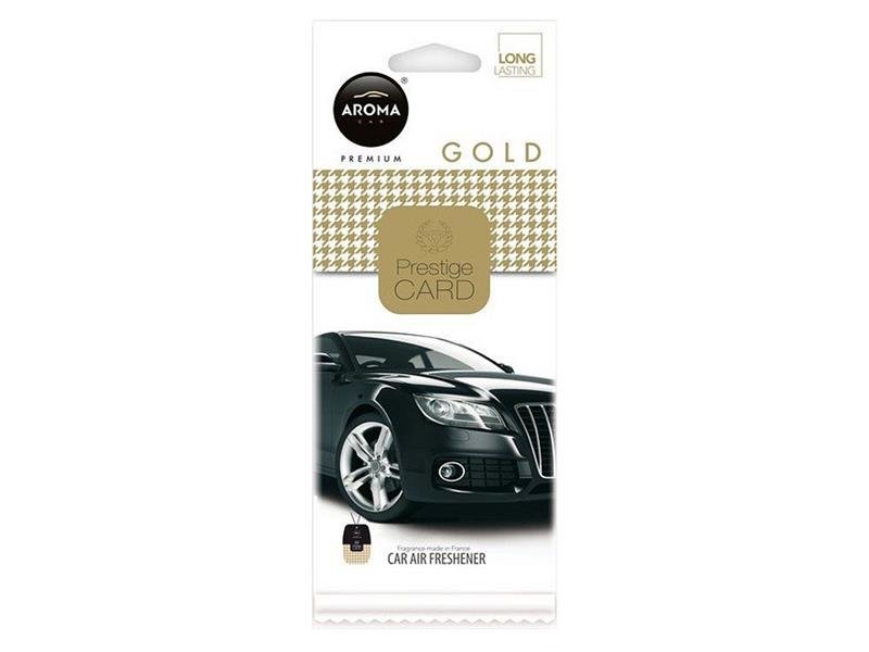 AROMA CAR PRESTIGE CARD GOLD: Moderní papírový osvěžovač vzduchu, vhodný pro ty, kteří nechtějí následovat trend, ale chtějí ho vytvářet, protože vědí, že skutečný styl je souhrnem denního výběru.