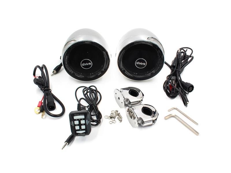 Voděodolný zvukový systém s reproduktory pro vychutnání si poslechu hudby během jízdy na motocyklu, skútru či čtyřkolce, s možností přehrávání z USB, Bluetooth nebo AUX vstupu.