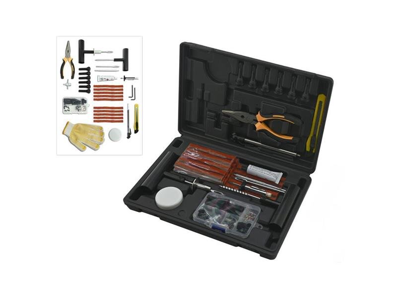 Sada obsahuje klasické opravné knoty včetně veškerého nářadí potřebného pro opravu, ale také vulkanizační šrouby, které opravu pneumatiky ještě více zjednoduší. Vulkanizační šrouby jsou speciální samořezné šrouby s hrubým závitem a vrstvou těsnicí hmoty. Součástí sady jsou rovněž další nástroje pro kontrolu stavu pneumatik, měříč hloubky dezénu a tlakoměr, dále pak rukavice pro pohodlnou manipulaci, lubrikant, klíč na ventilky, samotné ventilky včetně čepiček pro pneumatiky a nástavce pro ventilky.