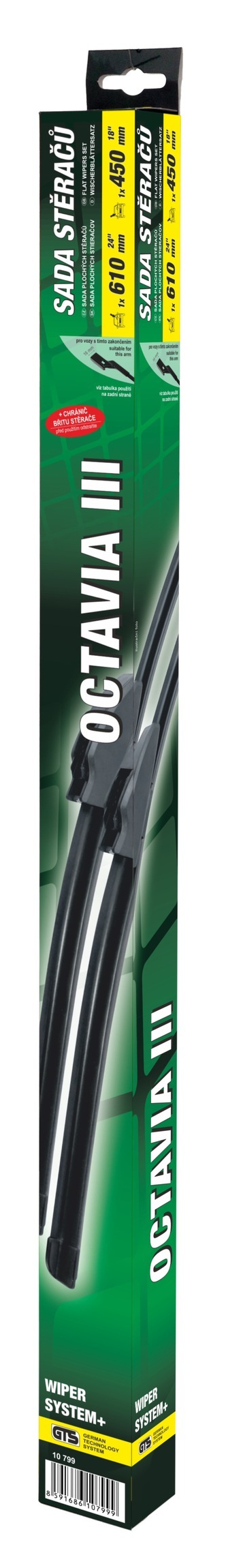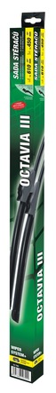 Tato sada stěračů je vhodná pro vozy Škoda OCTAVIA III, ale i další vozy (viz tabulka použití). Kvalitní pružný člen plochého stěrače zajišťuje stejnoměrný tlak grafitového břitu v celé jeho délce, což zamezuje rozmazávání nečistot a vytváření pruhů.