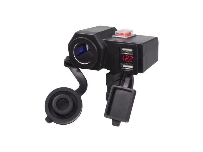 2x USB nabíječka, voltmetr a CL zásuvka, voděodolná, vhodná např. pro motocykly, čtyřkolky a jiné.Technické parametry:- napájecí napětí: 12 V- výstup USB: 2x 5 V ± 0,2 V- výstupní zatížení: 4,2 A- voděodolná krytka- LED voltmetr- včetně osvětleného vypínače- uchycení na řidítka a jiné...