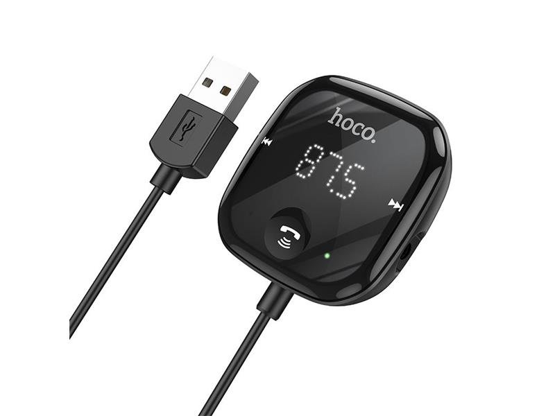 Bluetooth FM vysílač s dlouhým USB-A kabelem. Má čtečku paměťových karet a umožňuje telefonovat jako hlasitý odposlech.