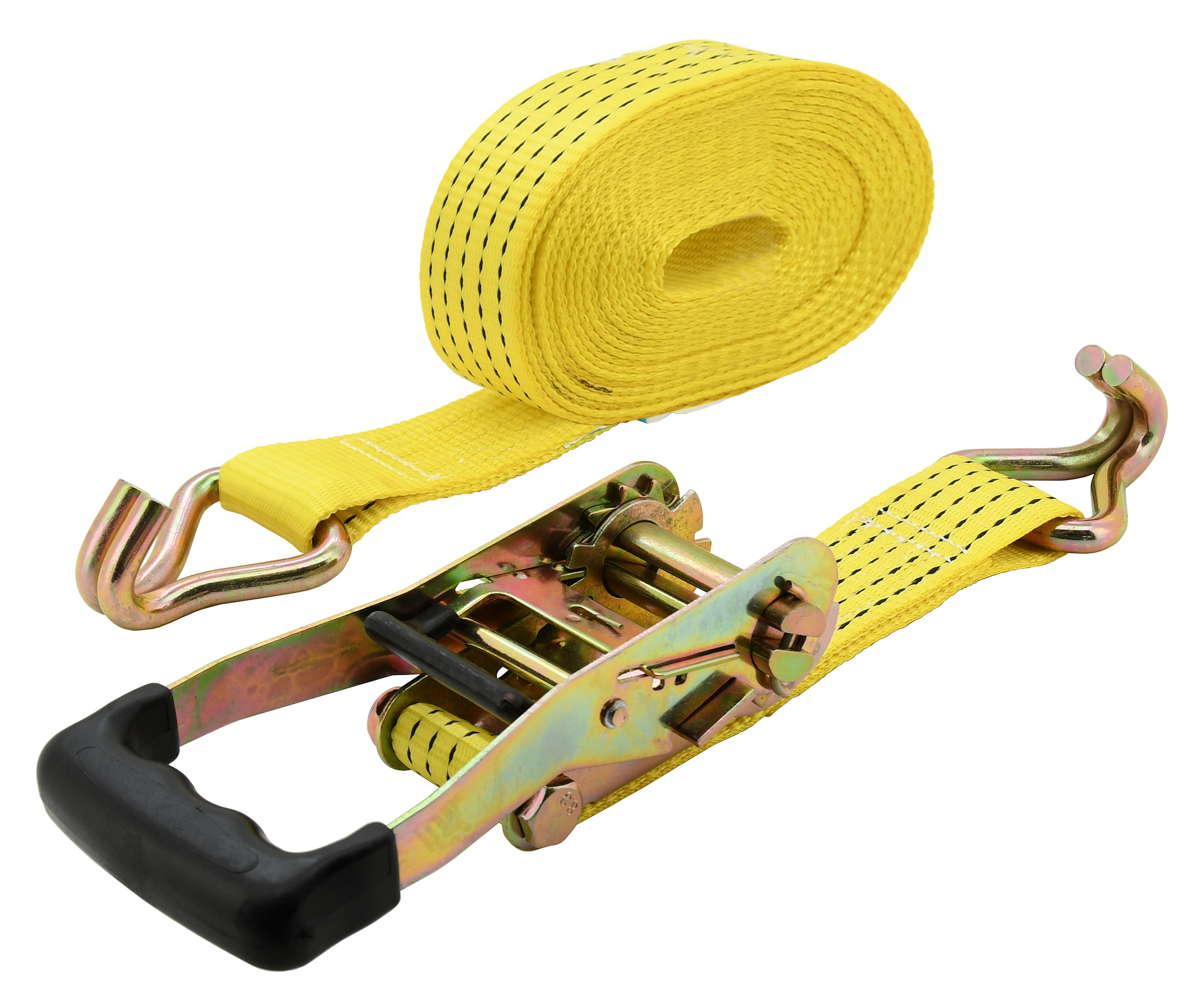 Upínací ráčnový popruh s kovovými háky, s homologací TÜV/GS, pro zajištění těžkého nákladu. Ráčna je celokovového provedení s odolným jistícím mechanismem, opatřeným plastovým madlem pro pohodlnou manipulaci a ovládání. Popruh šíře 50 mm s délkou 8 m se vyznačuje pevností v tahu 5000 kg (po...