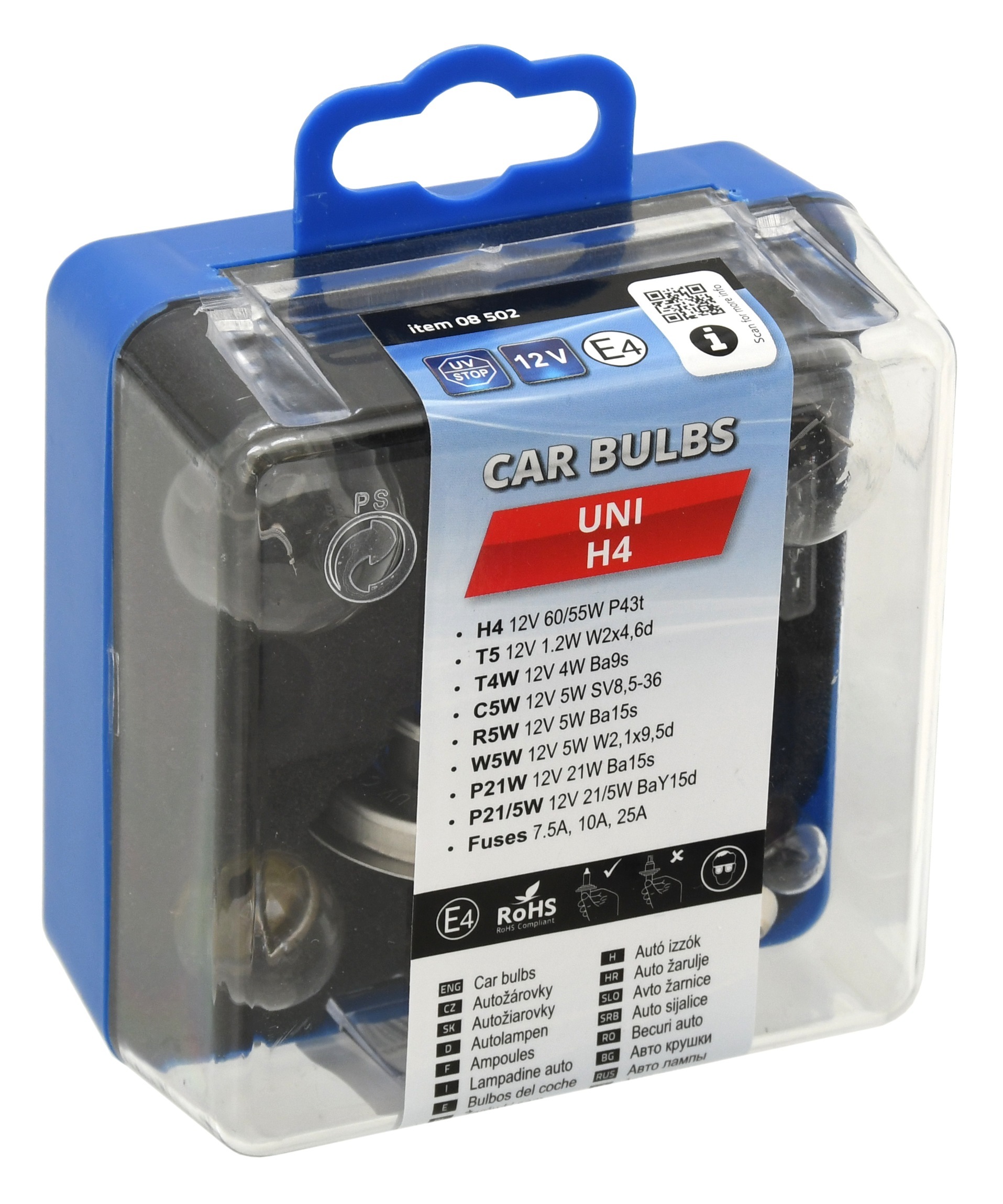 Plastová krabička náhradních autožárovek a pojistek, homologace E. Balení obsahuje: 1ks H4 12V 60/55W P43t1ks T5 - 12V 1.2W W2x4,6d1ks T4W - 12V 4W Ba9s1ks C5W - 12V 5W SV8,5-361ks R5W - 12V 5W Ba15s1ks W5W - 12V 5W W2,1x9,5d1ks P21W - 12V 21W Ba15s1ks P21/5W - 12V 21/5W BaY15d3ks pojistka nožová