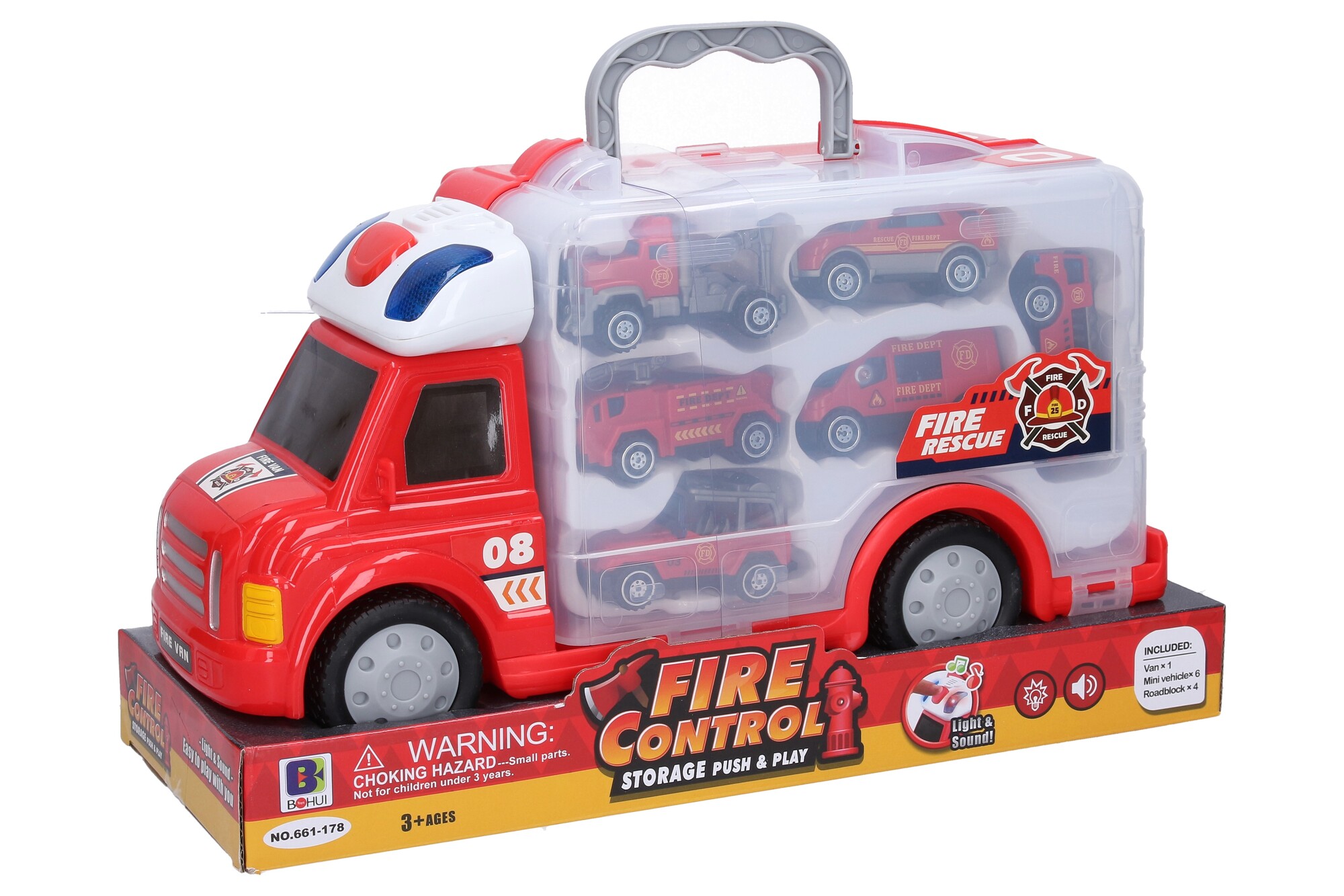 Auto hasičské s efekty a 6 malými auty. Rozměry velkého auta 34x12,5x18,5 cm, velikost malých aut 7-8 cm. Volná kola. Světelné a zvukové efekty, aktivace červeným tlačítkem na kabině. 2xAG13 baterie součástí. Obsahuje velké auto, 6 malých aut, semafor, fotobuňku, kužel, závoru.