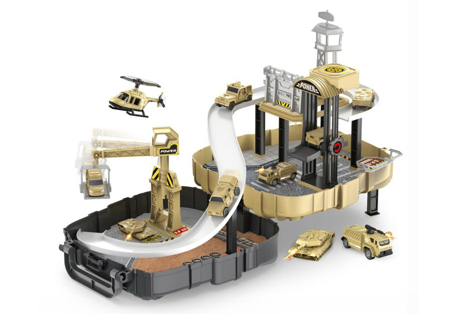Vojenská stanice se 2 auty v batohu. Stanice obsahuje dráhu, výtah, jeřáb, heliport, 2 auta. Batoh obsahuje popruhy. Obrázkový návod na sestavení na zadní straně obalu. prečítať celé