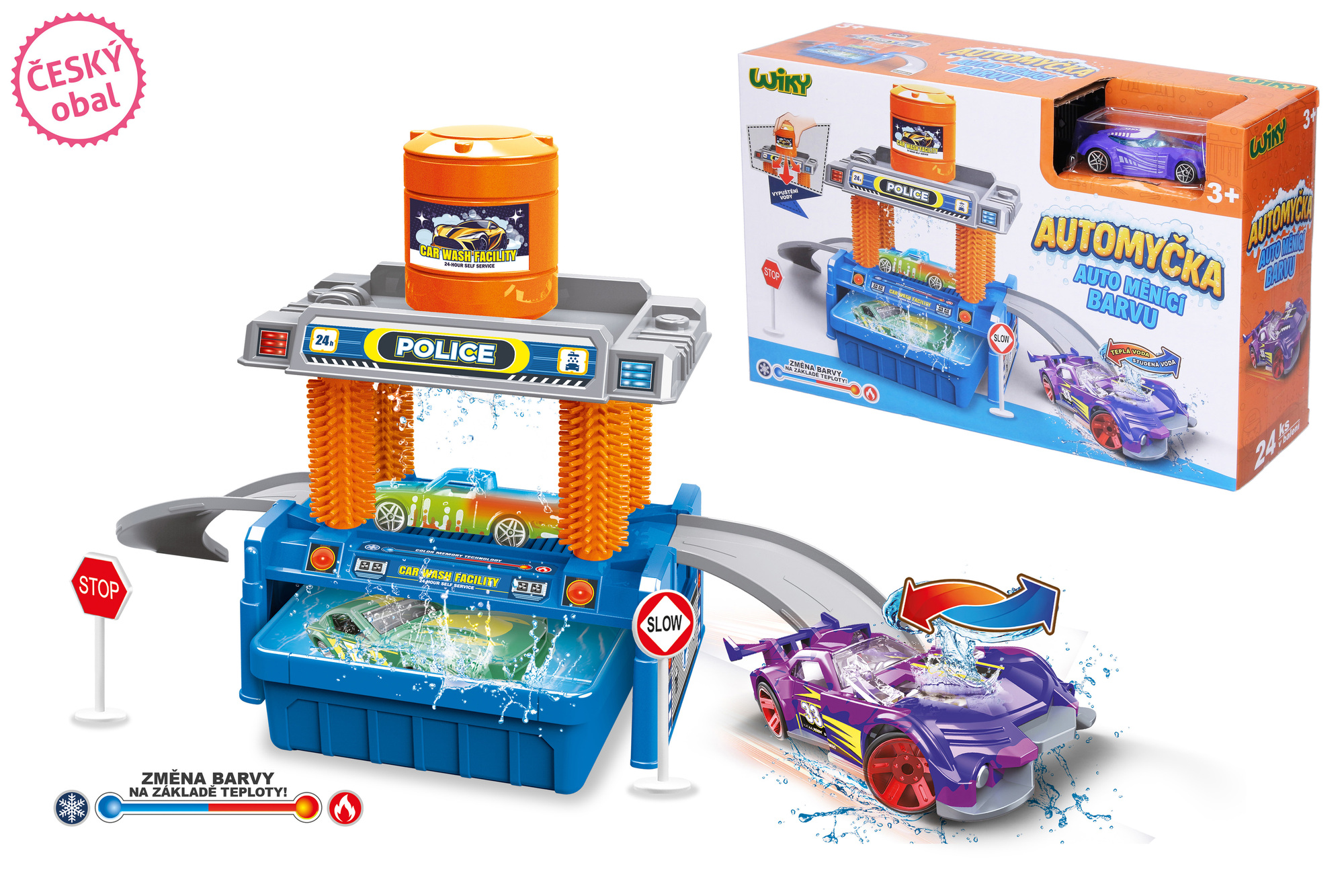 Auto měnící barvu podle teploty set s myčkou 35 cm. Rozměry myčky 35x16x24 cm. Auto 8 cm, volná kola. Auto mění barvu v závislosti na teplotě. Umyjte studenou vodou, nebo teplou vodou (více než 37°C). Nasajte do nádržky vodu (nádržka je měkká, zmáčknutím a uvolněním nasajete vodu). Nádržku...