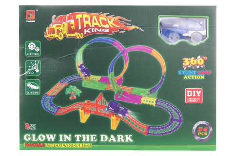 Barevná svíticí dráha se dvěma 360° otáčkami a mostem. Balení obsahuje 33 dílků a autíčko na baterky 2x AAA (nejsou součástí). Dráha ve tmě svítí. Rozměr balení cca 37,5 x 27,5 x 7 cm. Věk 3+ prečítať celé