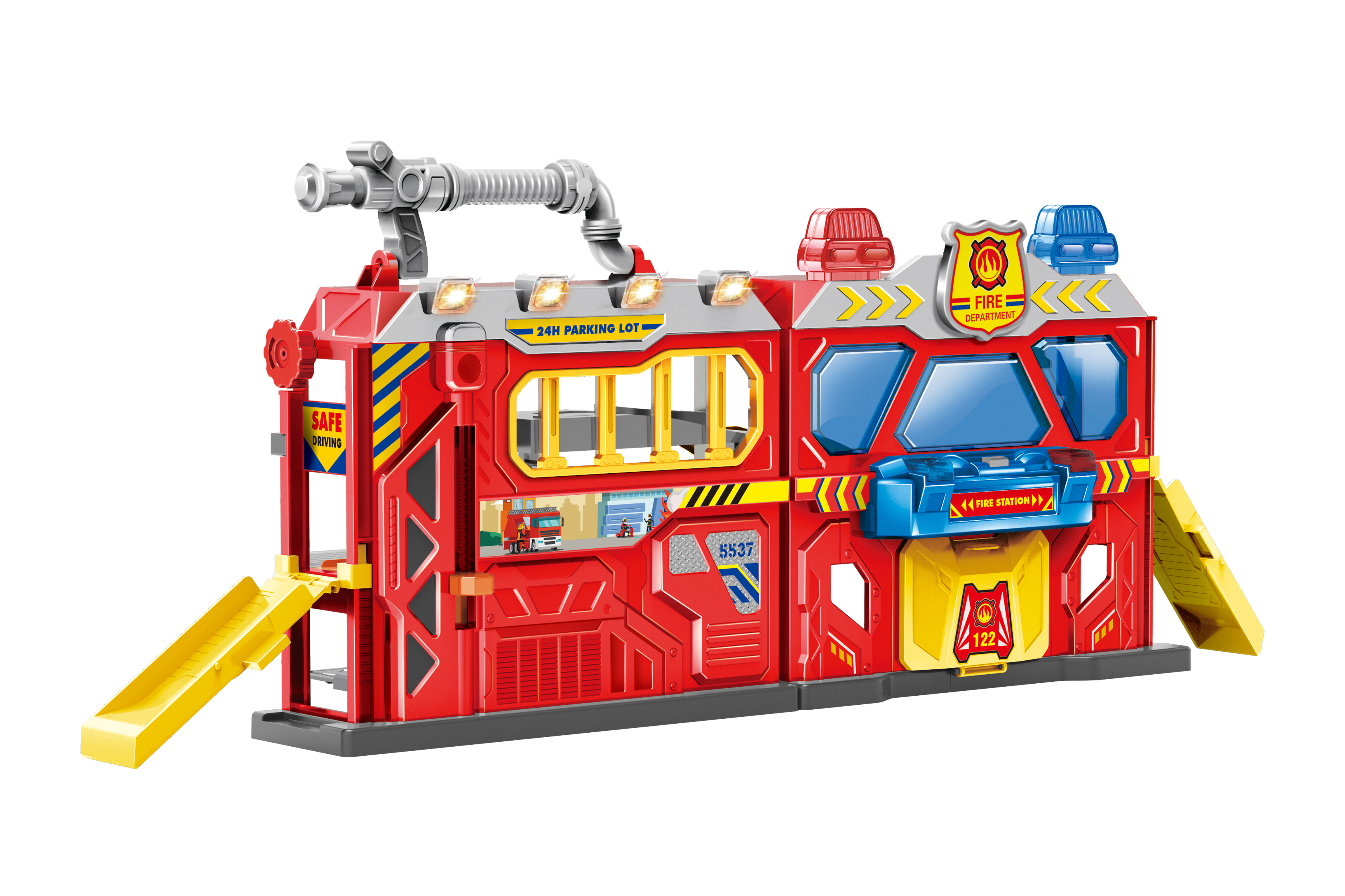 Hasičská stanice přenosná. Rozměry 56x18x23 cm. Světelné a zvukové efekty. Aktivace tlačítkem na modrém panelu. 3xAG13 baterie součástí. Součástí 2 auta s volnými koly, mnoho příslušenství (dopravní značky, hasičský přístroj, myčka, čerpací stanice, diagnostika a další).
