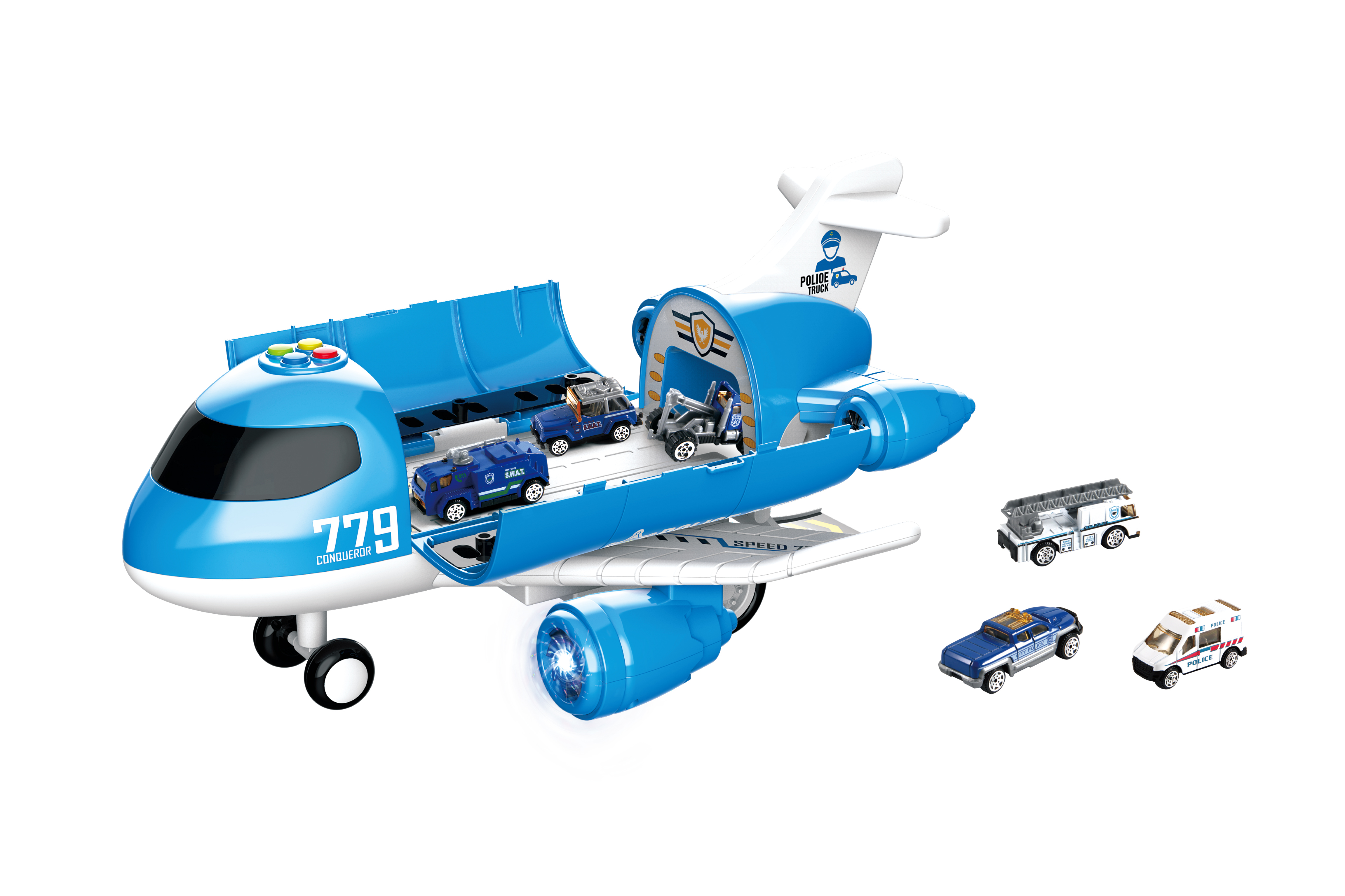 Letadlová stanice s efekty 6 aut. Letadlo 40 cm na setrvačník, auta 7 cm mají volná kola. Letadlo je otevíratelné, v ocasu se nachází rampa. Světelné a zvukové efekty, aktivují se 4 tlačítky v přední části letadla. 3xAA baterie nejsou součástí. prečítať celé