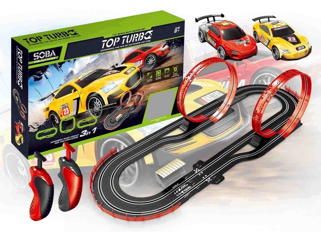 Autodráha na baterie se dvěma lopingy. Délka dráhy 560 cm, rozměry složené dráhy 138 x 58 x 36 cm. Autodráha obsahuje dva sportovní vozy, rovinky, zatáčky, díly pro dva lopingy, zúžení, napájecí díl na 8 baterií (baterie nejsou součástí), ovladače, svodidla a další příslušenství. Obal obsahuje návod na sestavení tří různých tvarů závodní tratě. Závodní auta mají funkční světla, můžete zkusit závodit i ve tmě. Autodráha je v měřítku 1:43. Vhodné pro děti od 8 let.