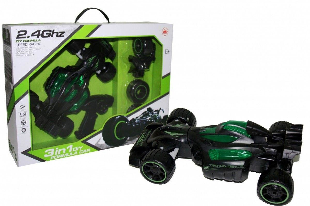 Zdalnie sterowany samochód wyścigowy. Skala: 1:12, częstotliwość 2,4Ghz. Zasięg: 50 metrów, a maksymalna prędkość 10 km/h. Możliwość zmiany samochodu na trzykołowy (w zestawie dodatkowe koła). Wymaga użycia baterii: 2 x 1,5V AA pilot (nie dołączono) + 6V akumulator (dołączono).