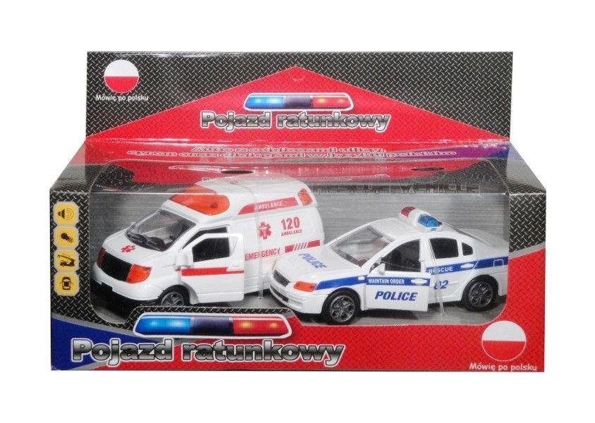 Zestaw aut ratunkowych z polskim modułem dźwiękowym. Tu wóz policyjny oraz karetka. Pojazdy świecą kolorowymi światełkami oraz wydają odgłosy syren i ulicy, a także dialogi: "Uwaga wypadek potrzebna pomoc"; "Oj ostrożnie jest bardzo ślisko"; "Przyjęliśmy zgłoszenie, ruszamy na akcję"; "Zwolnij!...