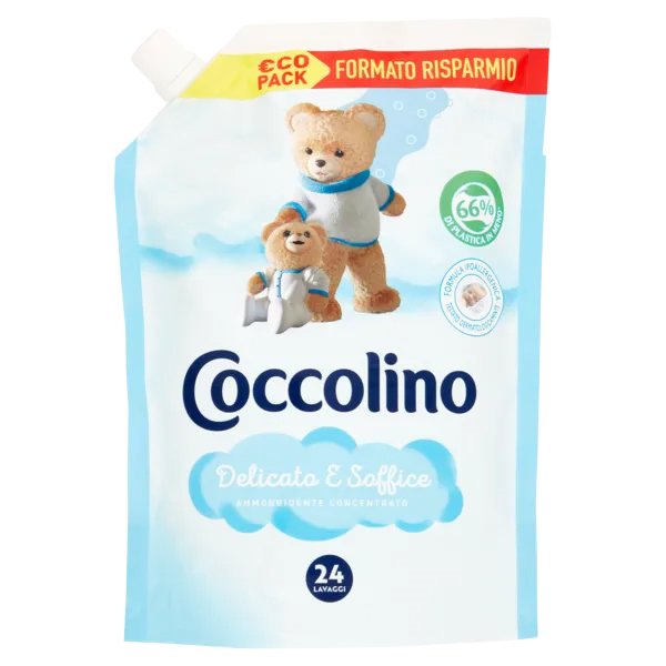 koncentrovaný avivážní přípravek značky Coccolino, který je v ekologickém balení s možností doplnění do původního obalu nebo dávkování přímo z tohoto ekologického balení, které je znovuuzavíratelné. Aviváž Coccolino Delicato je velice jemná a vhodná i pro osobny s citlivou pokožkou a pro děti.