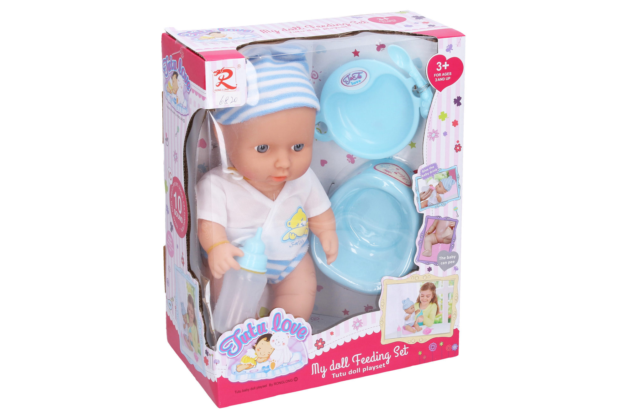 Miminko čurající. Velikost 30 cm. Miminko pije z lahvičky. Obsahuje miminko, lahvičku, nočník, talířek a lžičku. Miminko vydává 10 různých zvuků. 3xAG13 baterie součástí. prečítať celé