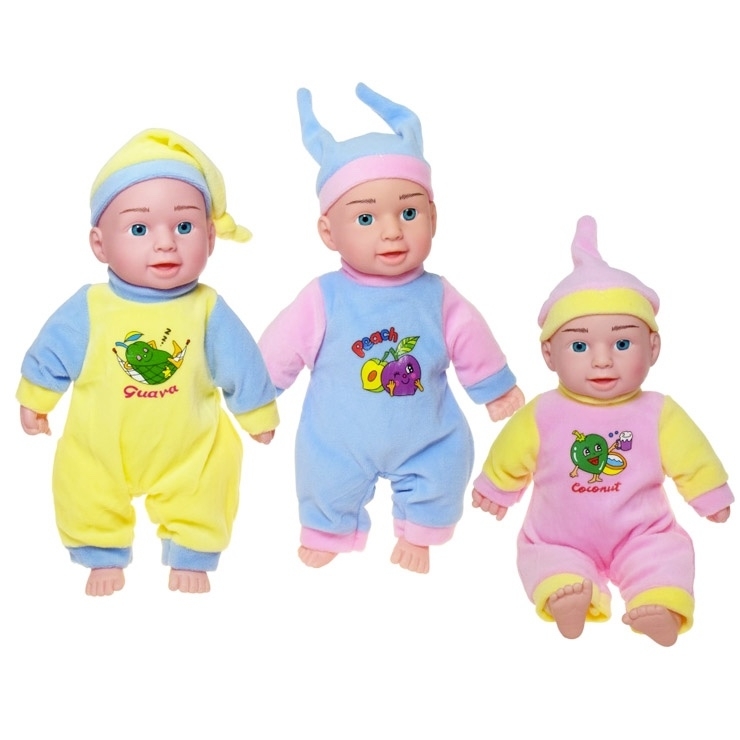 Usmievavé miminko s mäkkým telíčkom. Bábika po vytiahnutí poistky zo strojčeka bľabotá - mama, papa. Možnosť výberu z troch farieb oblečenia - modré, žlté alebo ružové. Nevhodné pre deti do 3 rokov.Výška - 26cm prečítať celé