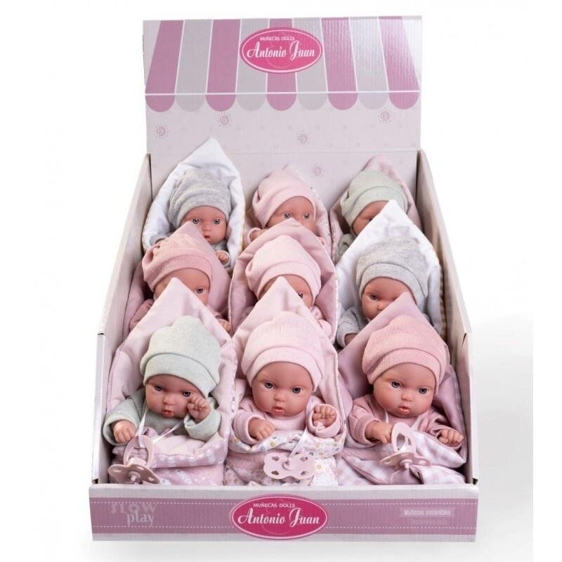 Zestaw Picolin 9 lalek ze smoczkami i śpiworkami 21 cm Antonio Juan 85318 Niewielkie, winylowe lalki hiszpańskie renomowanej marki Antonio Juan, umieszczone w elegancko wyglądającym biało-różowym standzie proponujemy szczególnie do sklepów stacjonarnych. 21-centymetrowe bobaski o uroczych...