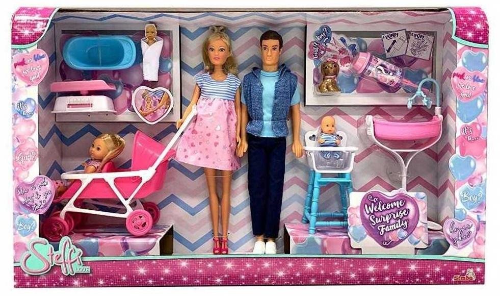 Mama Steffi, tato Kevin, Evie z bratem, sympatyczny piesek, i w najbliższym czasie... chłopiec czy dziewczynka? Aby się tego dowiedzieć, trzeba nacisnąć pojemnik dołączony do zestawu i zobaczyć jakiego koloru będzie jego zawartość.Zawartość zestawu:lalki: Steffi, Kevin, Evi i jej brat,figurka...