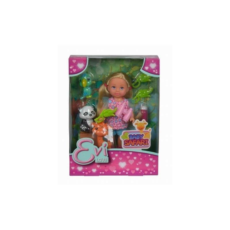 Evi na SafariEvi w uroczym stroju safari z 3 zwierzątkami, lornetką, jedzeniem i butelką. prečítať celé