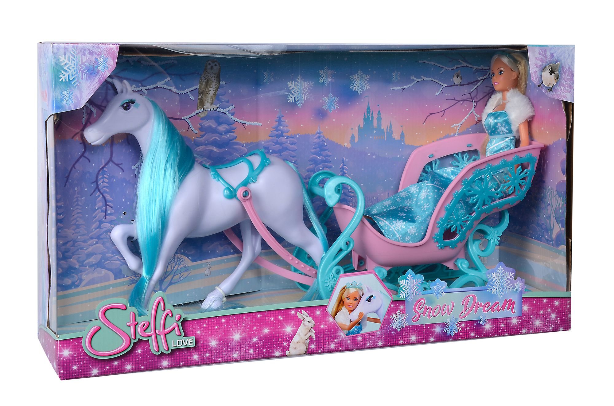 Panenka Steffi jako ledová princezna, s koněm a kouzelnými zimními saněmi. Délka 60 cm. Velikost panenky 29 cm. prečítať celé