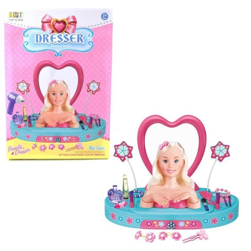 Toaletka z głową do czesania i makijażu to idealny zestaw, aby dziecko stworzyło własny salon piękności. W zestawie znajdziemy Toaletę z lusterkiem i popiersiem lalki oraz akcesoria do makijażu i czesania.Dziecko może czesać lalkę, tworzyć liczne fryzury, koki, warkoczy, czy finezyjne upięcia....
