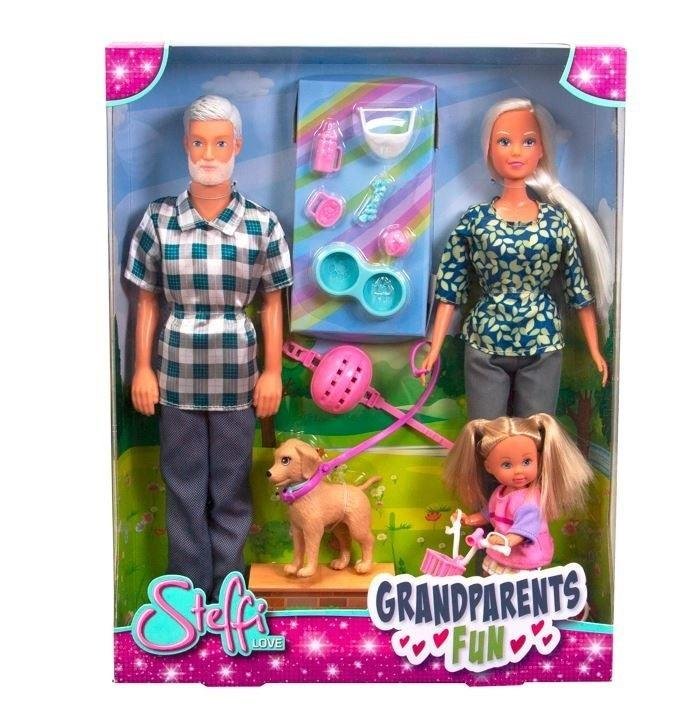 Zestaw lalek Steffi - Dziadkowie z wnuczką. Laleczki odznaczają się wysoką jakością. Dziadkowie mają siwe włosy. Prowadzą pieska na smyczy. Mała wnuczka jest umieszczona na rowerku. W opakowaniu znajdziemy również dodatkowe akcesoria (np. miseczki dla psa, czy bidon). Produkt posłuży do odegrania mnóstwa scenariuszy.
