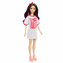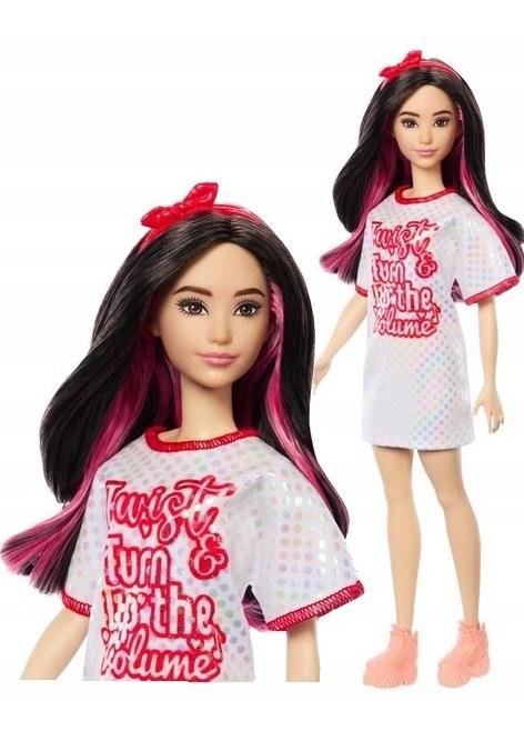 Ta lalka Barbie(R) Fashionistas ma na sobie strój inspirowany jej stylizacją Twist 'n Turn z 1969 r.: białą luźną sukienkę z opalizującymi kropkami i czerwonym napisem.Różowe buciki na platformie i czerwona opaska z kokardką nadają temu strojowi nutkę nowoczesności.Lalka Barbie(R) o drobnej sylwetce ma czarne falowane włosy z różowymi pasemkami, które świetnie podkreślają jej styl.