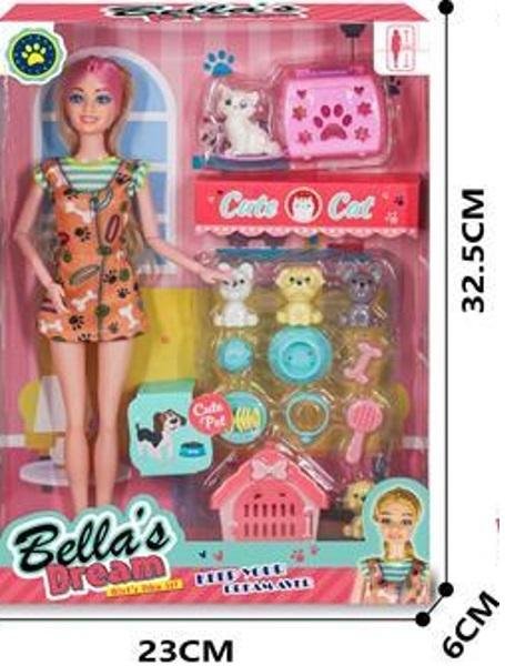 Lalka typu Barbie w zestawie z kotkami i pieskami. W zestawie dołączono również akcesoria dla pupili takie jak: transportery, miska, szczotka, jedzenie, talerz, obroża. Produkt zapakowany w kartonowe opakowanie z przezroczystym okienkiem. Zabawka dla dzieci od 3 lat. Podane wymiary są wymiarami opakowania.
