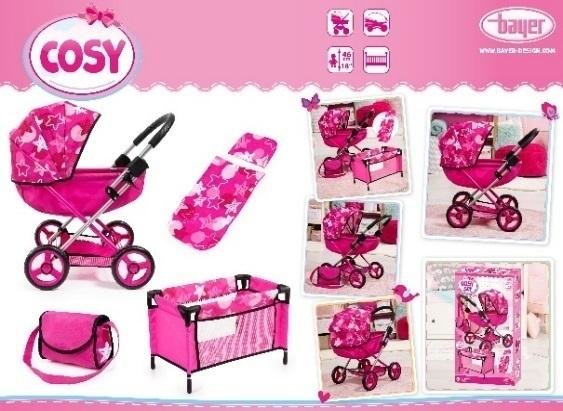Zestaw akcesoriów dla lalek skladajacy sie z: wózka dla lalek Cosy (wraz z poduszka i kocykiem), lózeczka dla lalki oraz praktycznej torby na ramie. Wózek dla lalek COSY posiada piekny design, a dzieki przytulnemu kocykowi i dopasowanej poduszce zapewni lalce spokojne i slodkie sny. W wózku...