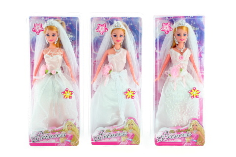 Panenka o velikosti cca 28 cm kloubová. Panenka je oblečená do svatebních šatů, součástí jsou troje náušnice, závoj a lodičky. Rozměry balení cca 33 x 14 x 6,5 cm. Věk 3+ prečítať celé