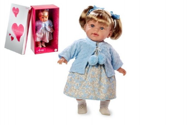 Panenka Arias vonící 42cm modré šaty smějící se měkké tělo na baterie v krabici