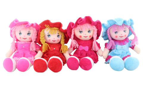 Látková panenka o velikosti cca 35 x 14 x 8 cm. Panenka po zmáčknutí bříška zpívá. Napájení na 3 AG13 baterie (jsou součástí). Panenka má měkké tělíčko. Věk 0+ prečítať celé