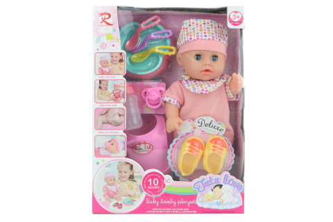 Toto interaktívne bábätko po vložení batérií vydáva autentické zvuky a dokonca močie, čo zaručuje skutočný zážitok pri hraní. Súčasťou balenia sú aj praktické doplnky ako topánočky, plastový podbradník, fľaštička a tanierik, ktoré obohatia detskú predstavivosť a umožnia oveľa pestrejšiu a zábavnejšiu hru. Bábätko má kompaktné rozmery 30 x 12 cm, vďaka čomu sa ľahko drží a prenáša.