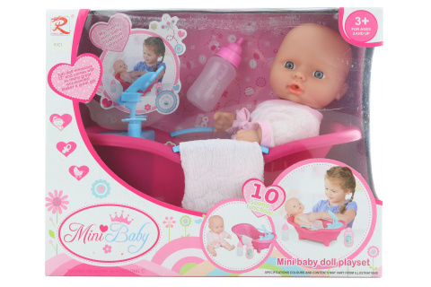 Miminko s vaničkou a doplňky. Panenka po vložení baterií vydává zvuky a čůrá. Balení obsahuje vaničku o velikosti cca 26 x 15 cm, ručník a lahvičku. Napájení na 3 AG13 baterie (jsou součástí balení). Rozměry balení cca 31 x 24,5 x 18,5 cm. Věk 3+ prečítať celé