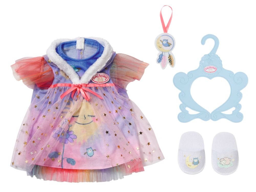 Baby Annabell se každý večer, když jde spát, těší na svou noční košilku Sladké sny – není divu, hravé šatičky s jemným potiskem a tylovými rukávy jsou perfektním oblečením, aby se v postýlce Sladké sny nechala unášet do země snů. Lapač snů ji chrání před zlými sny a pantoflíčky udrží nohy v teple.