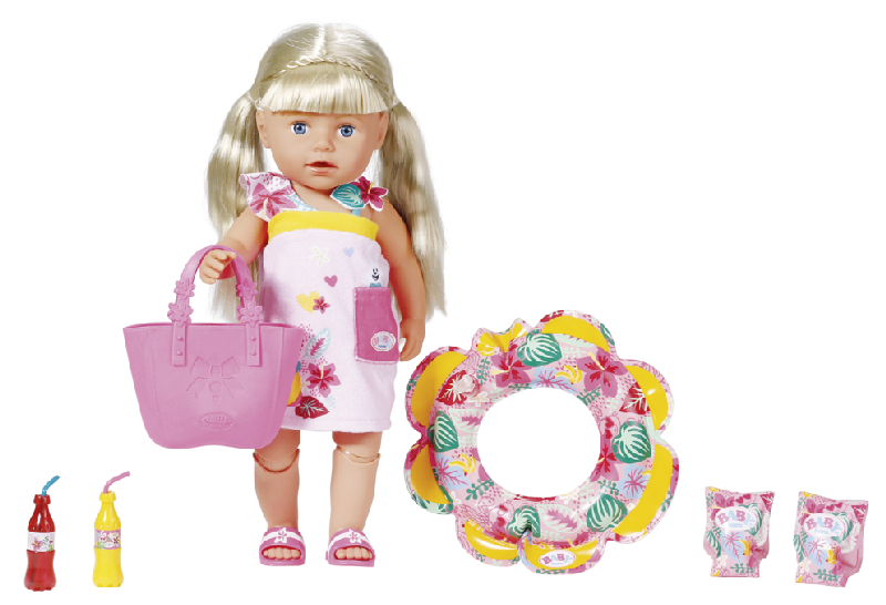 Jsou prázdniny! Pojďme na pláž. Na mělčině BABY born zkouší plavat. Na pomoc si do vody přinesla kruh a křidélka s krásným designem amazonského pralesa. Po plavání BABY born oschne na osušce, která se může změnit na plážové šatičky. Aby si na horkém písku nespálila chodidla, na cestu ke stanu...