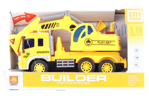 Plastový kamion s bagrem na baterie. Po stisknutí tlačítek vydává zvuky a svítí. Napájení 3x AG13/LR44 baterie - jsou součástí balení. Rozměr balení cca 32,5 x 19 x 12 cm. Věk 3+ prečítať celé
