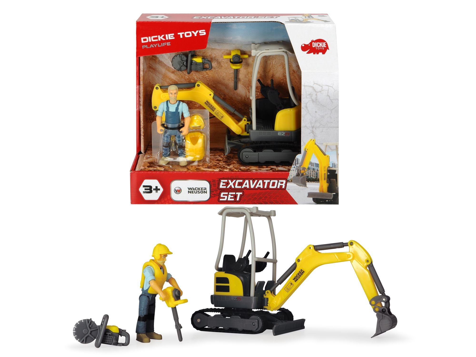 Pásový bagr Wacker Neuson EZ17 na volnoběh. Součástí figurka dělníka s helmou a vestou, bourací kladivo a flexa. V měřítku 1:24, délka 19,5 cm. prečítať celé