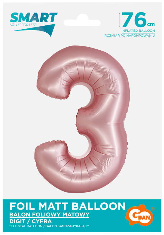 Balon foliowy Smart, Cyfra 3, j. różowa matowa, 76 cm, GoDan