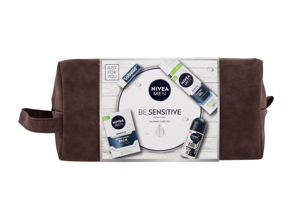 Nivea Men Sensitive balzám po holení Men Sensitive 100 ml + gel na holení Men Sensitive 200 ml + antiperspirant roll-on Black & White Invisible Original 50 ml + balzám na rty Labello Men Active 4,8 g + kosmetická taštička
