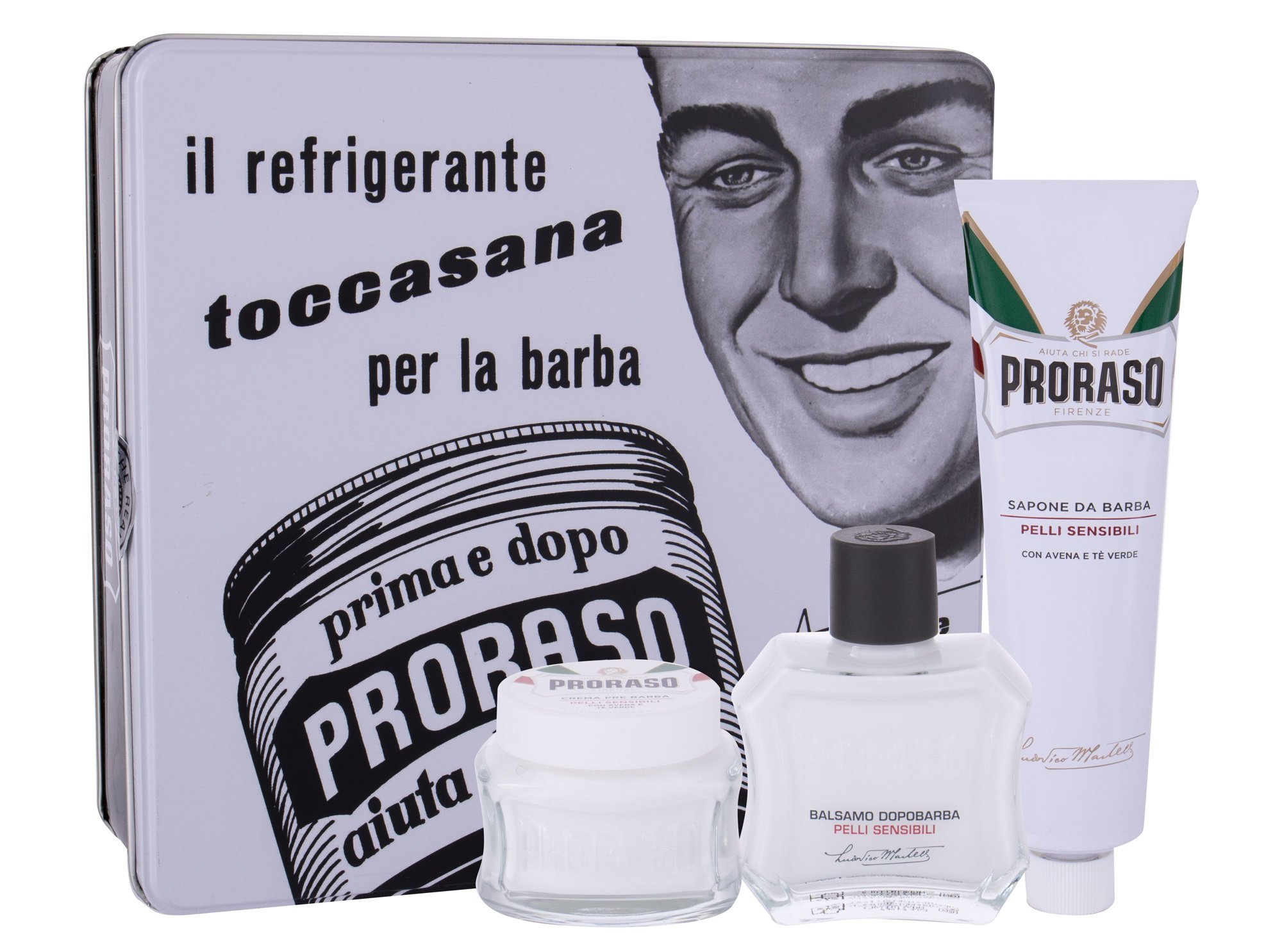 PRORASO White balzám po holení 100 ml + mýdlo na holení 150 ml + krém před holením 100 ml + plechová dóza