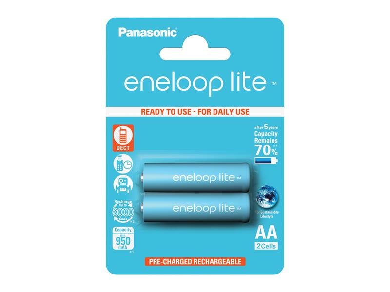Tužkové baterie AA (R6) speciálně navržené pro DECT telefony s 3000 dobíjecími cykly a kapacitou min. 950 mAh, které mají maximálně eliminovaný efekt samovybíjení. Díky speciální technologii udrží tyto baterie po dobu pěti let až 70% své kapacity. Baterie Eneloop Lite se dodávají v nabitém stavu a jsou připraveny k okamžitému použití.