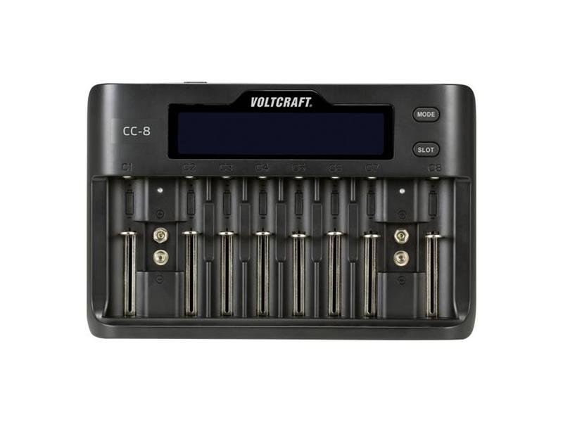 Voltcraft CC-8-nabíjí NiMH/ NiCD, Li-Ion a LiFePo4. Nabíječka je kompatibilní s maximální délkou akumulátor 74 mm. Nabíječka má deset nezávislých nabíjecích slotů, včetně dvou 9V bloků . LCD zobrazuje všechny potřebné informace, jako např. Akumulátor napětí (V), nabíjecí proud (mA), kapacita (mAh) a stavu v % pro vybrané slot.